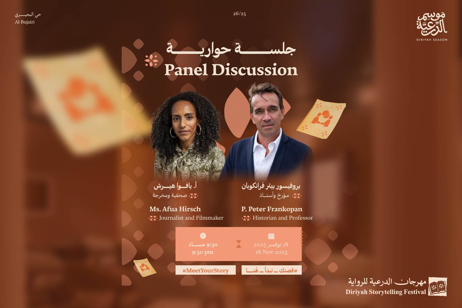المتحدثون: أ. يافوا هيرش والبروفيسور بيتر فرانكوبان لغة الجلسة: الإنجليزية تجمع هذه الجلسة بين أفوا هيرش وبيتر فرانكوبان، مقدّمي البودكاست العالمي Legacy، لمناقشة دور السرد في تشكيل فهمنا للتاريخ والإرث الثقافي. من خلال أعمالهما، يستكشفان كيف يستمر الماضي في التأثير على الهوية والثقافة والسرد العالمي، وكيف يمكن إعادة رواية التاريخ بطريقة أكثر شمولاً وصدقًا وإنسانية. تتعمّق الجلسة في فنّ السرد التاريخي، وكيف يمكن التقاط الإرث ليس كذاكرة جامدة، بل كحوار حيّ بين الأجيال والأمكنة والزوايا الفكرية المختلفة.